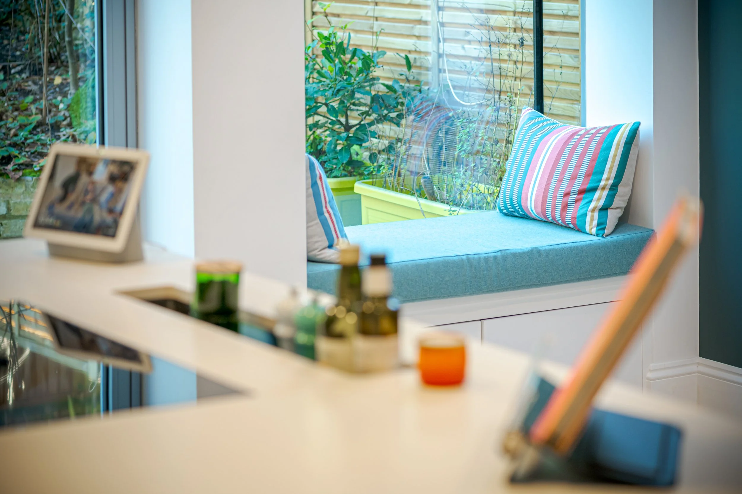 We knocked through the kitchen and dining room to create a large open-plan kitchen, dining area and sitting area - this then had the benefit of bringing daylight in to the room on both sides. Even on the darkest winter day this is now an attractive, luminous room, where the family spends most of their time.